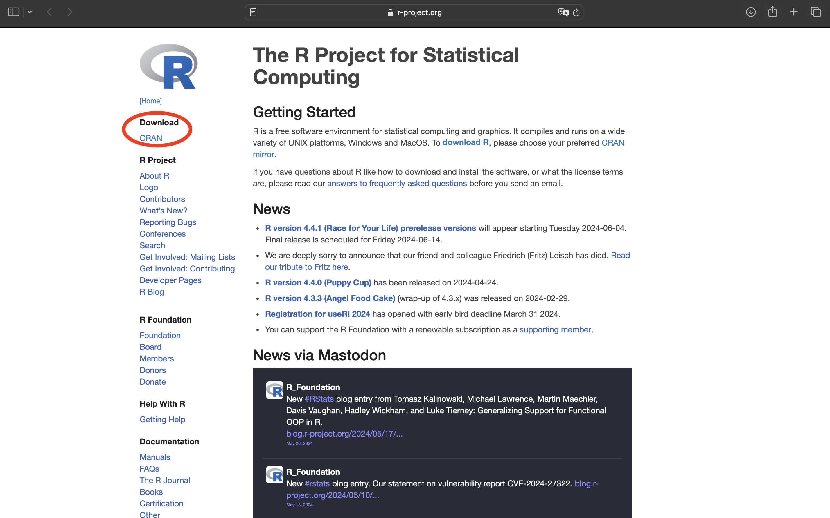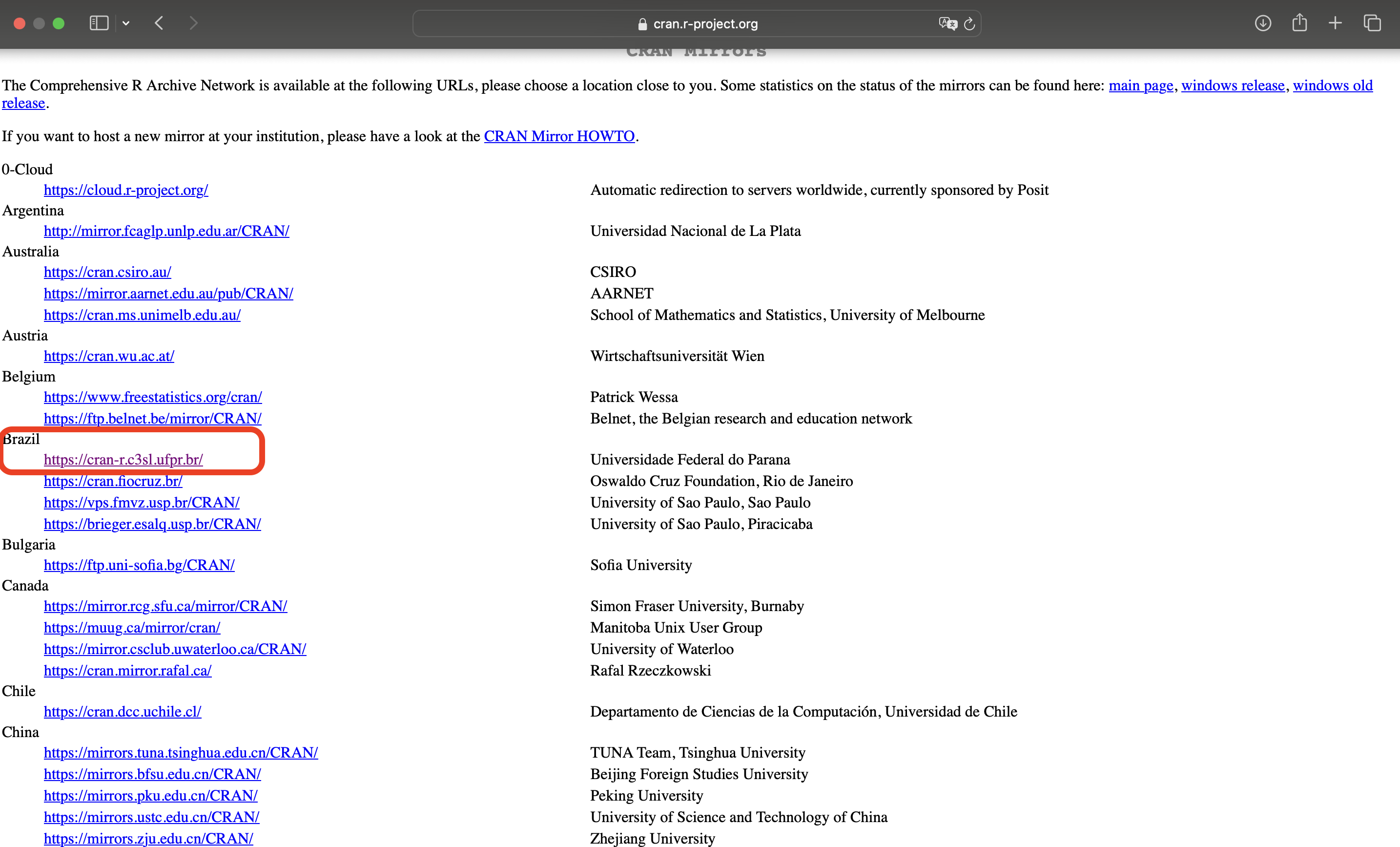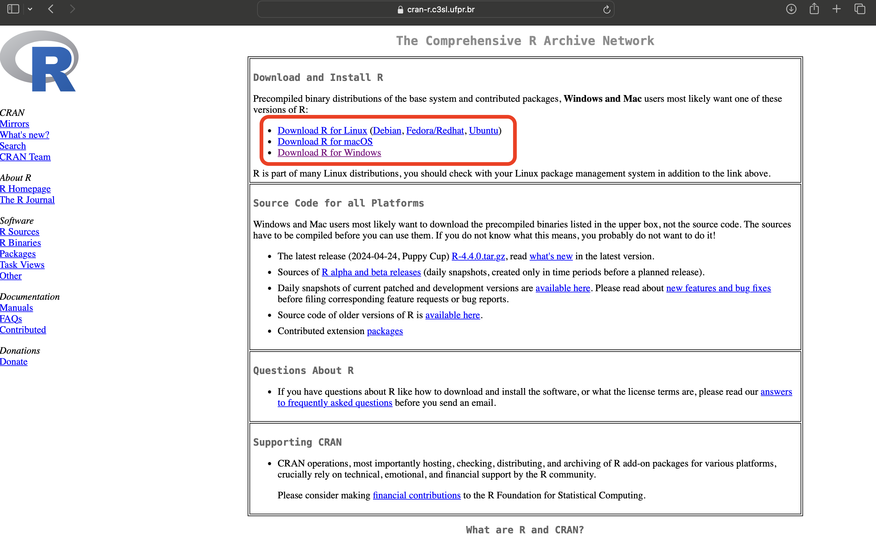 Acessar o site https://www.r-project.org e clicar em CRAN.