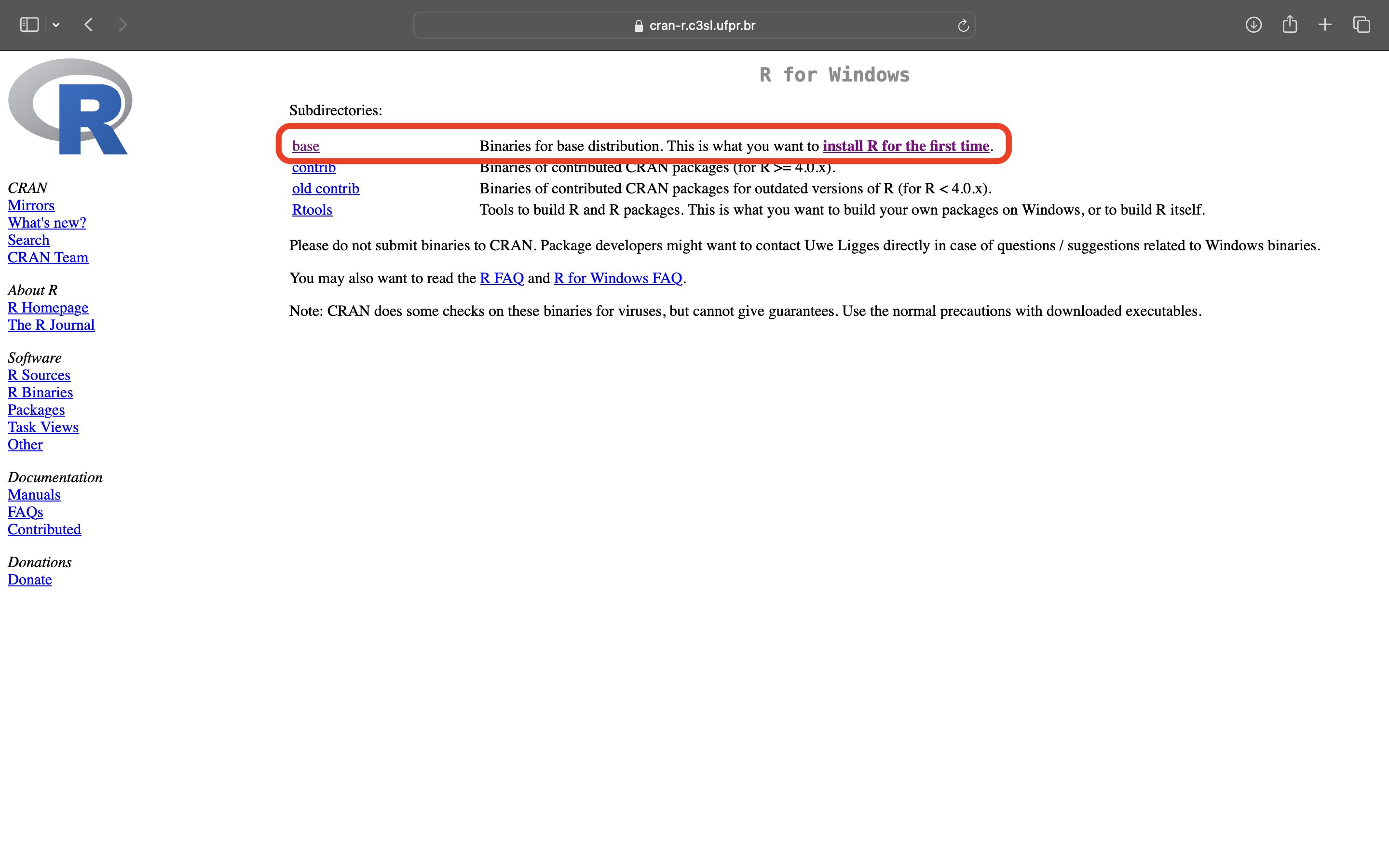 Escolher a versão de download que seja compatível com seu sistema operacional. Neste caso “Download R for Windows”.